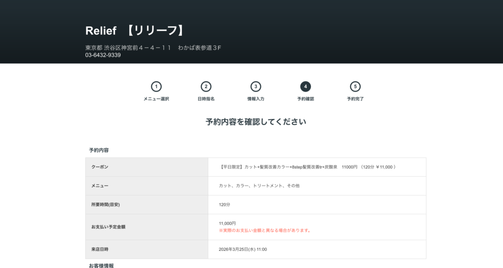 ⑥ご予約を内容を確認して、お間違いがなければ、予約を確定するを押して、ご予約完了です。