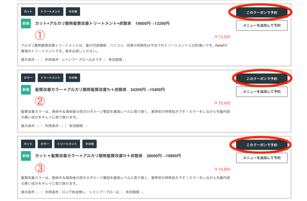 ①カット付き、②カラー付き、③カットカラー付きのクーポンです。お好きなクーポンをお選び下さい。